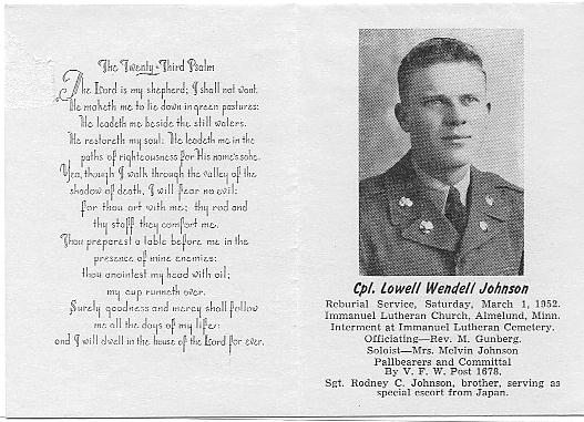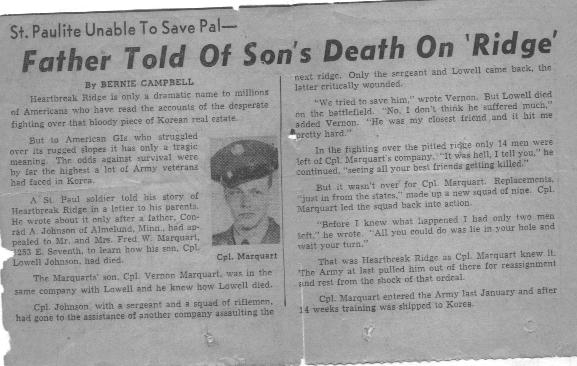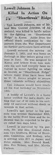 ![]() Newspaper Account of Lowell Johnson's Death at Heartbreak Ridge Korea