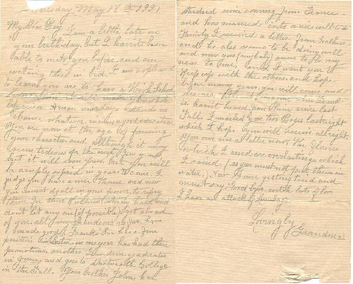 ![]() Letter to Cecil Wallis from Grandmother (Carrie (Tyler) Wallis?) 1921